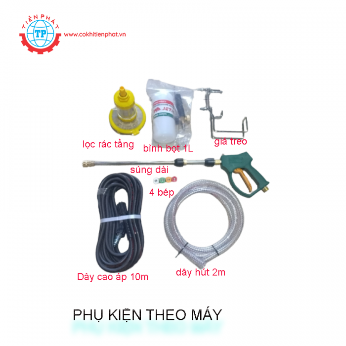 • Phụ kiện : Dây cao áp 10m, Súng cao áp 1 súng , béc phun gồm 04 chiếc…